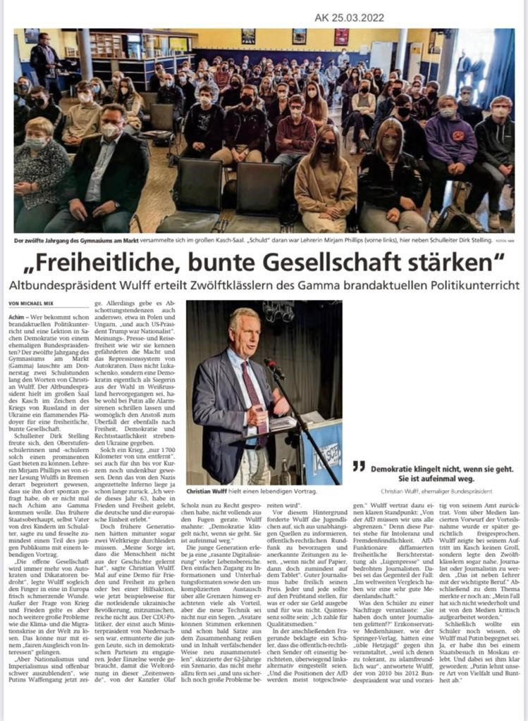 Am 24. März 2022 sprach Bundespräsident a.D. Christian Wulff mit den Schülerinnen und Schülern des 12. Jahrgangs der Gymnasiums am Markt in Achim. Die Schülerinnen und Schüler stellten spannende Fragen zum Thema Demokratie, zum Krieg in der Ukraine oder auch zur Rolle der Medien in unserer digitalisierten Zeit.